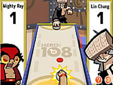 An air hockey battle between Mighty Ray and Lin Chung. Just hit the puck for a goal.