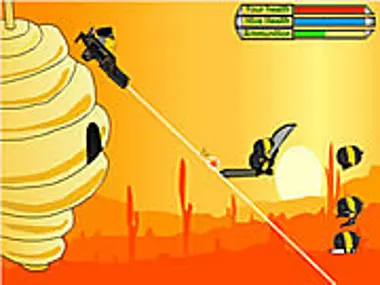 Shoot and launch grenades at the incoming bees that are trying to attack your hive.