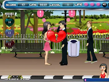 Use the mouse to interact. Select the gender and kiss your lover who will be dressed in different costumes. Find out and kiss your lover among the other people who resemble your lover. Attain the kissing target with the given color-dresses worn by your lover before the stipulated time gets over. Each time, when the bar gets filled, one kissing target will get reduced from the list. If you kiss the wrong person, you will lose a life. Avoid kissing while other people stare as otherwise you will a life.