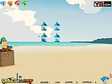 Shoot the cages to free the birds. You have targets shown on your left top screen. Score points to buy and Upgrade at the shop.